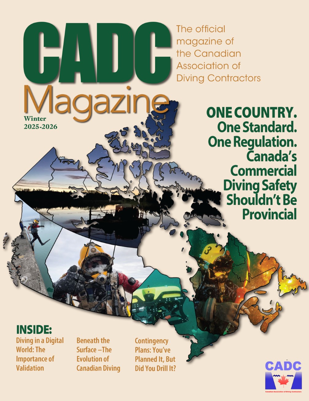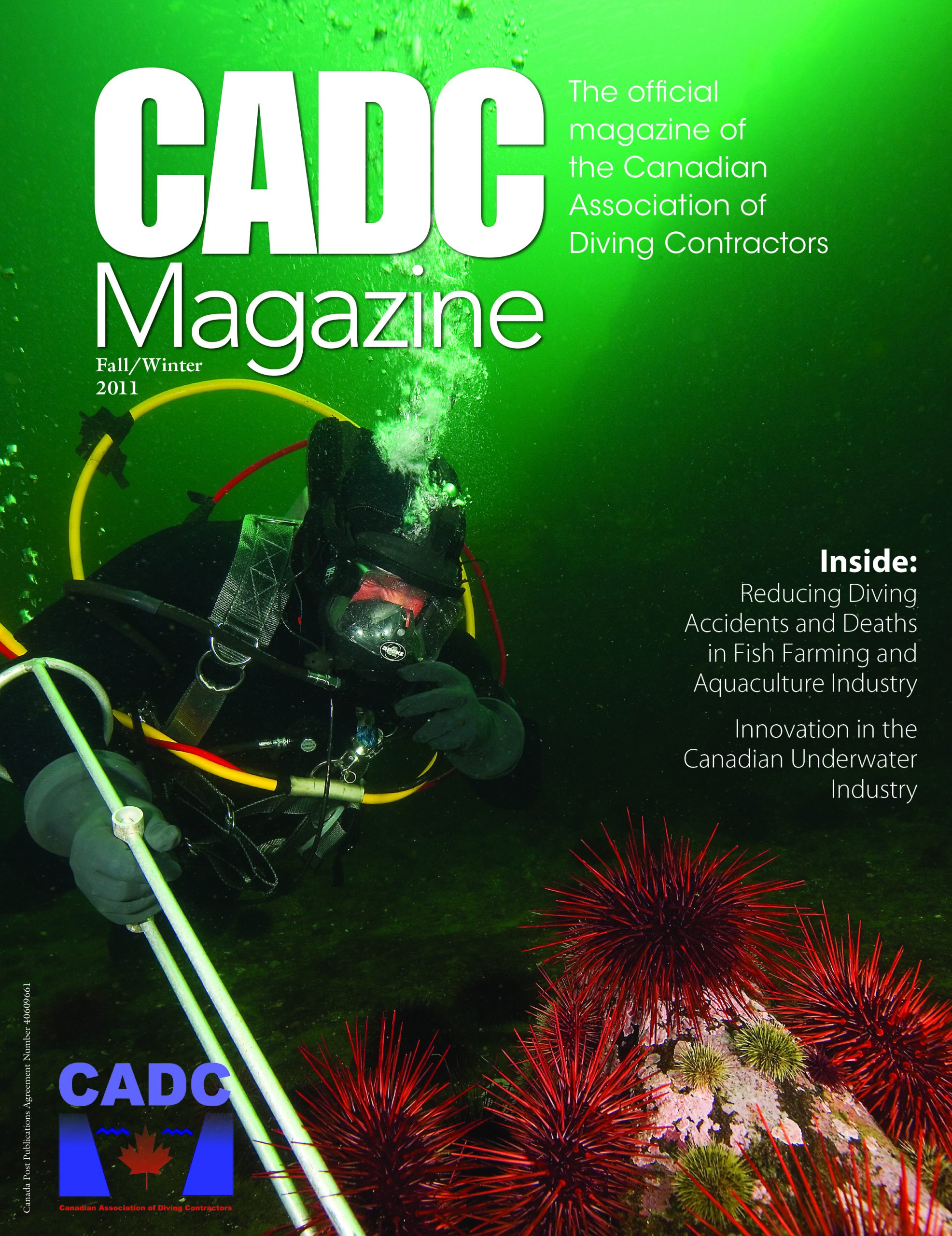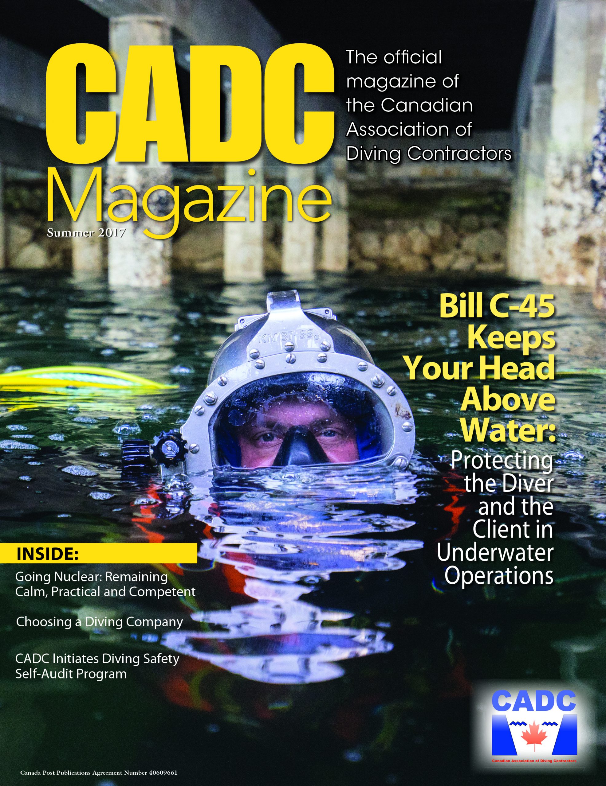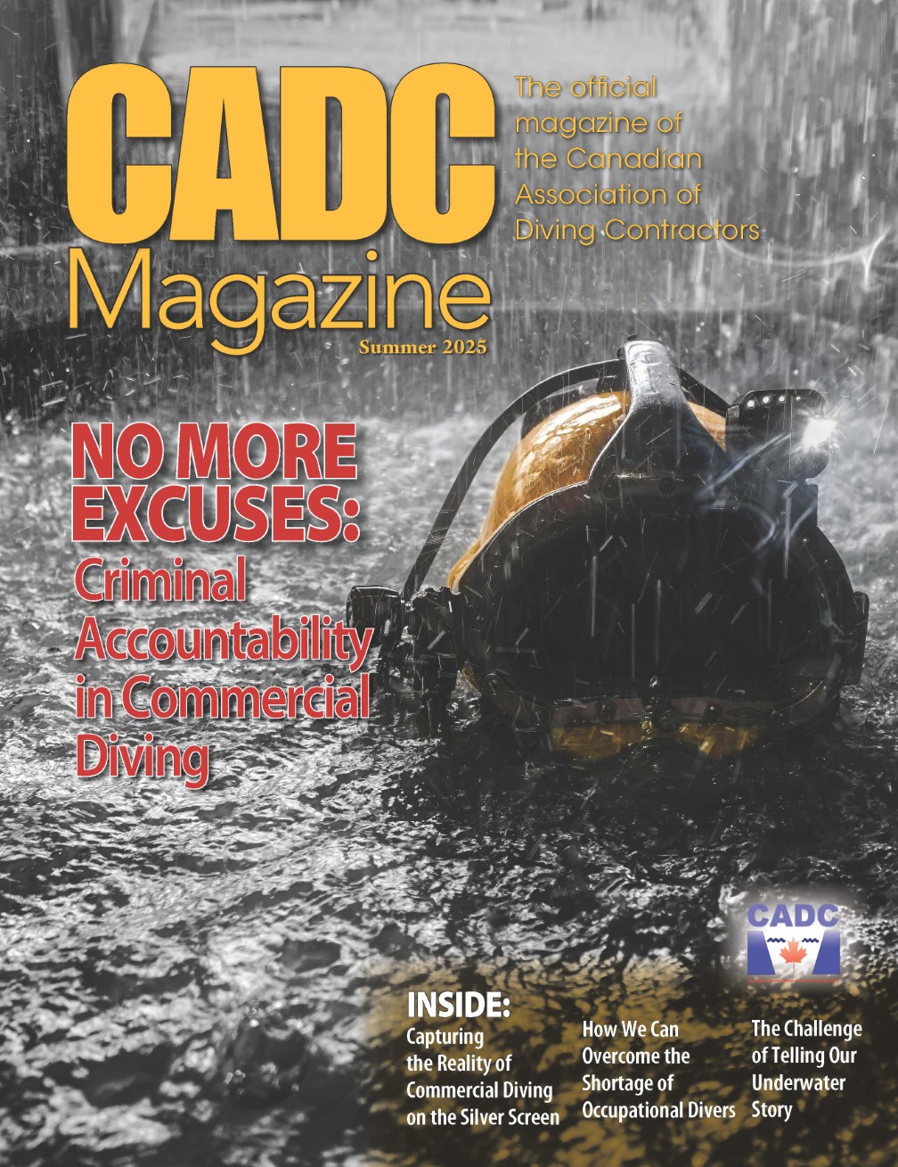 CADC Magazine is the official publication of the Canadian Association of Diving Contactors (CADC). It is published twice per year and features content that is written by members who are experts in their areas of specialty. The articles are great sources of information and assist the men and women who run Canada’s underwater diving operations by increasing their knowledge on important sector topics, from diver safety, standards, and regulations to the importance of hiring a professional diving underwater contractor, to showcasing our members’ commercial underwater operations both nationally and internationally, and much more. Each issue also features a resource guide listing all current CADC members, with contact information.